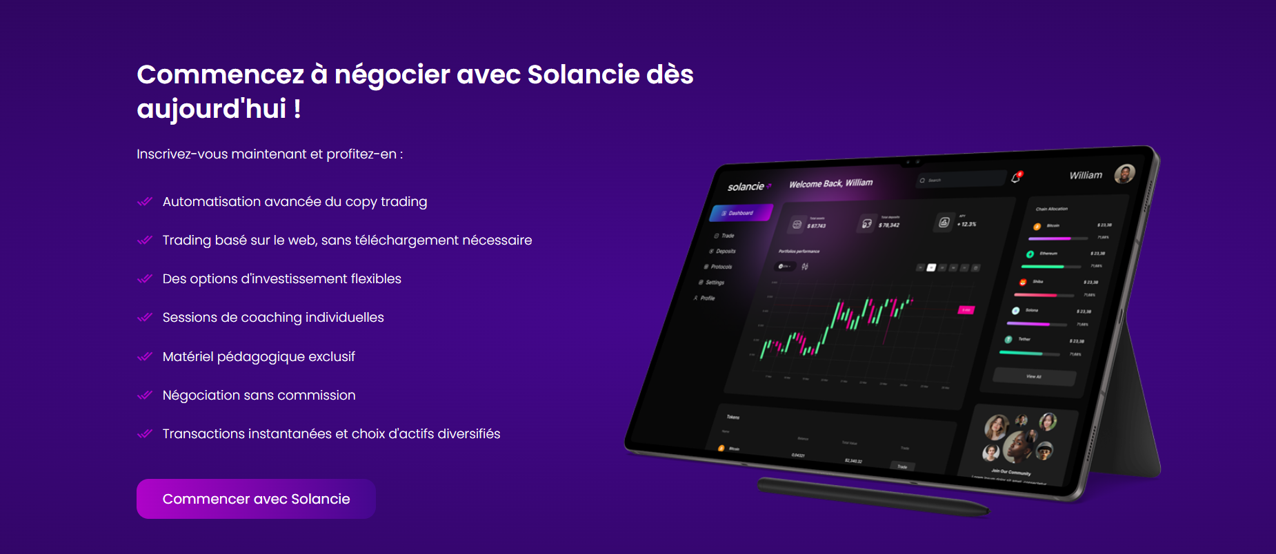 Solancie présente une interface claire et professionnelle. Le site propose du crypto-trading, du forex, des matières premières, des actions et des indices. Cette variété attire les débutants et donne une image de plateforme complète. De plus, Solancie souligne des fonctions modernes comme la copie de trading et l’automatisation des positions. Ces outils semblent sérieux au premier abord.